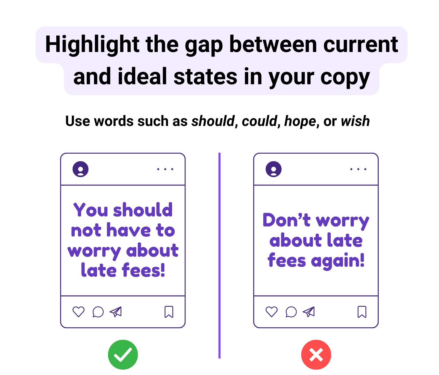 Focus your message on the difference between what your audience is experiencing and what they truly want. For instance, instead of saying, “ACME Solutions provides coverage,” try “You shouldn’t have to worry about coverage with ACME Solutions.” This approach makes readers feel seen and pushes them to engage with your brand.