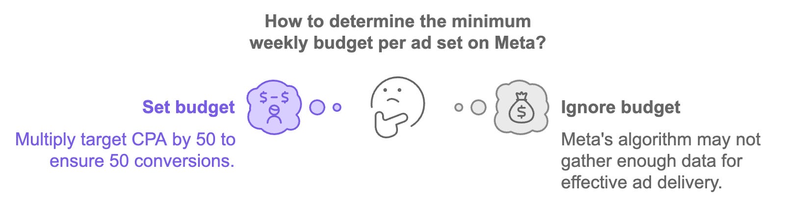 Meta needs 50 conversions per week to exit the learning phase. Calculate your weekly budget by multiplying your CPA by 50. For instance, with a $40 CPA, allocate $2,000 weekly per ad set. Without sufficient data, Meta’s algorithm can’t optimize effectively.
