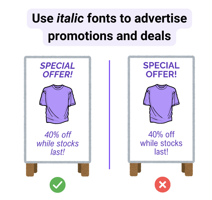Italics aren’t just a stylistic choice—they’re a behavioral trigger. Using slanted fonts for promotions can enhance urgency, engagement, and purchase intent. Incorporate this technique thoughtfully, pairing it with deal-sensitive audiences and clear, concise messaging.