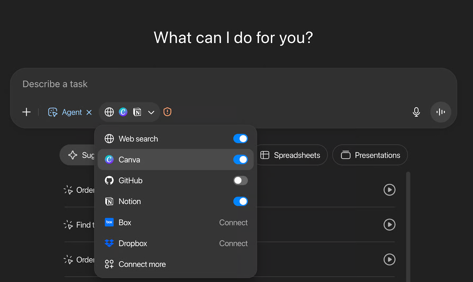 In ChatGPT, click the “+” icon to activate Agent Mode and connect your Canva account through Connectors. This enables ChatGPT to navigate Canva directly and manage your templates.