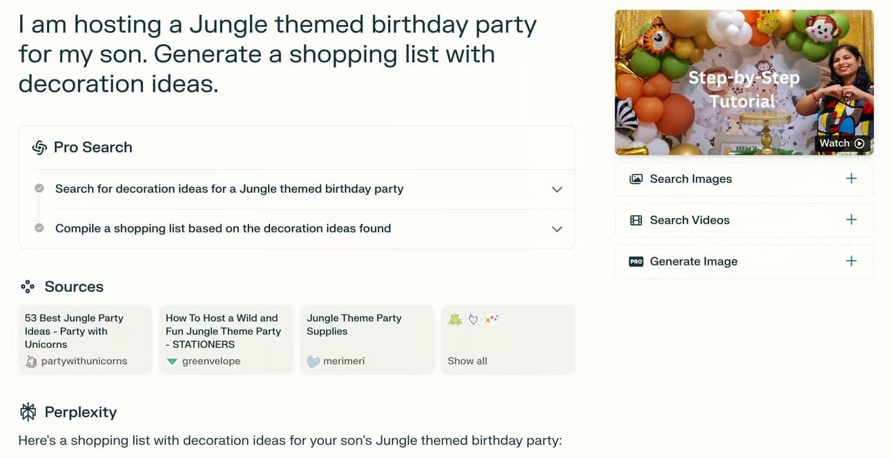 Review the detailed answer provided by Perplexity. The response includes product recommendations presented as visual cards, along with videos and descriptions for additional context.