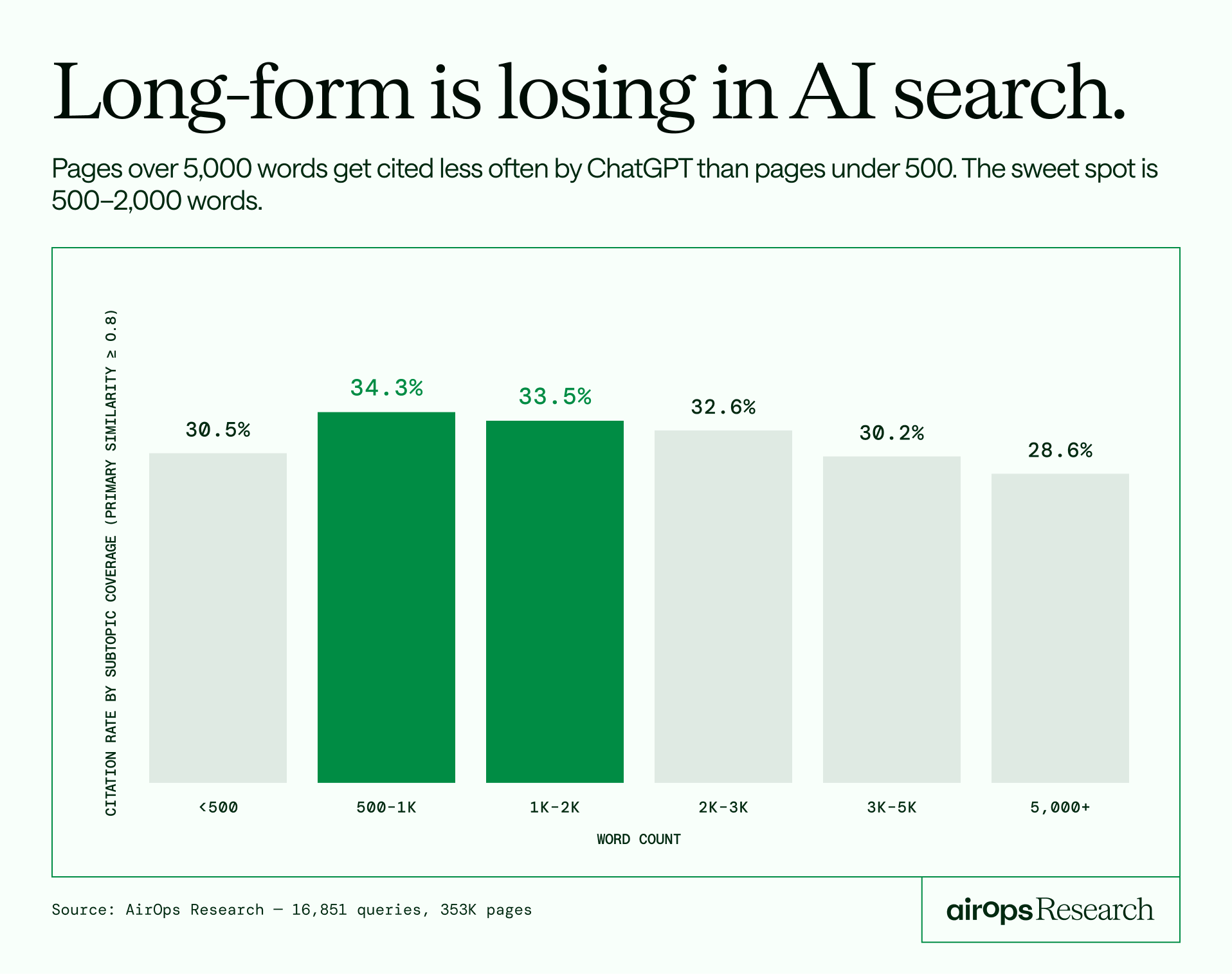 📄 Your longest pages are your least cited ones - Pages over 5,000 words get cited less than pages under 500. The content your team is most proud of is probably the least visible to AI.