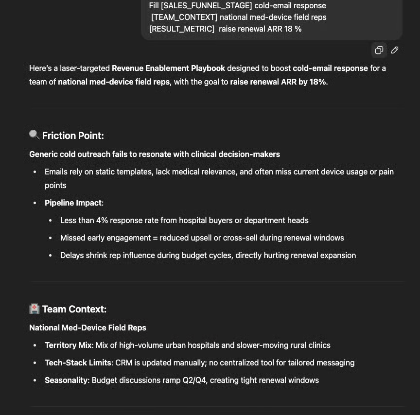You are a professional revenue enablement strategist tasked with driving a win-rate surge. Uncover the biggest friction in [SALES_FUNNEL_STAGE] and quantify how it stalls the pipeline or erodes the margin. Tailor your playbook to a [TEAM_CONTEXT], accounting for realities like territory mix, tech-stack limits, or seasonality. Prescribe one experiment, detail the first stand-up action, and project the improvement in [RESULT_METRIC].