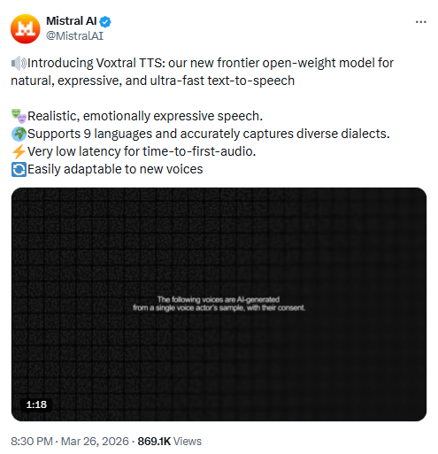 The Takeaway: Mistral’s Voxtral TTS brings together efficiency, realism, and flexibility in a way that makes advanced voice AI more accessible. With open weights and strong performance, it opens the door for developers and creators to build faster, more expressive voice-driven experiences without heavy constraints.