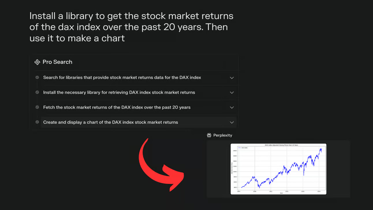 Perplexity will automatically search for Python libraries, install them, fetch the data, and create the chart.