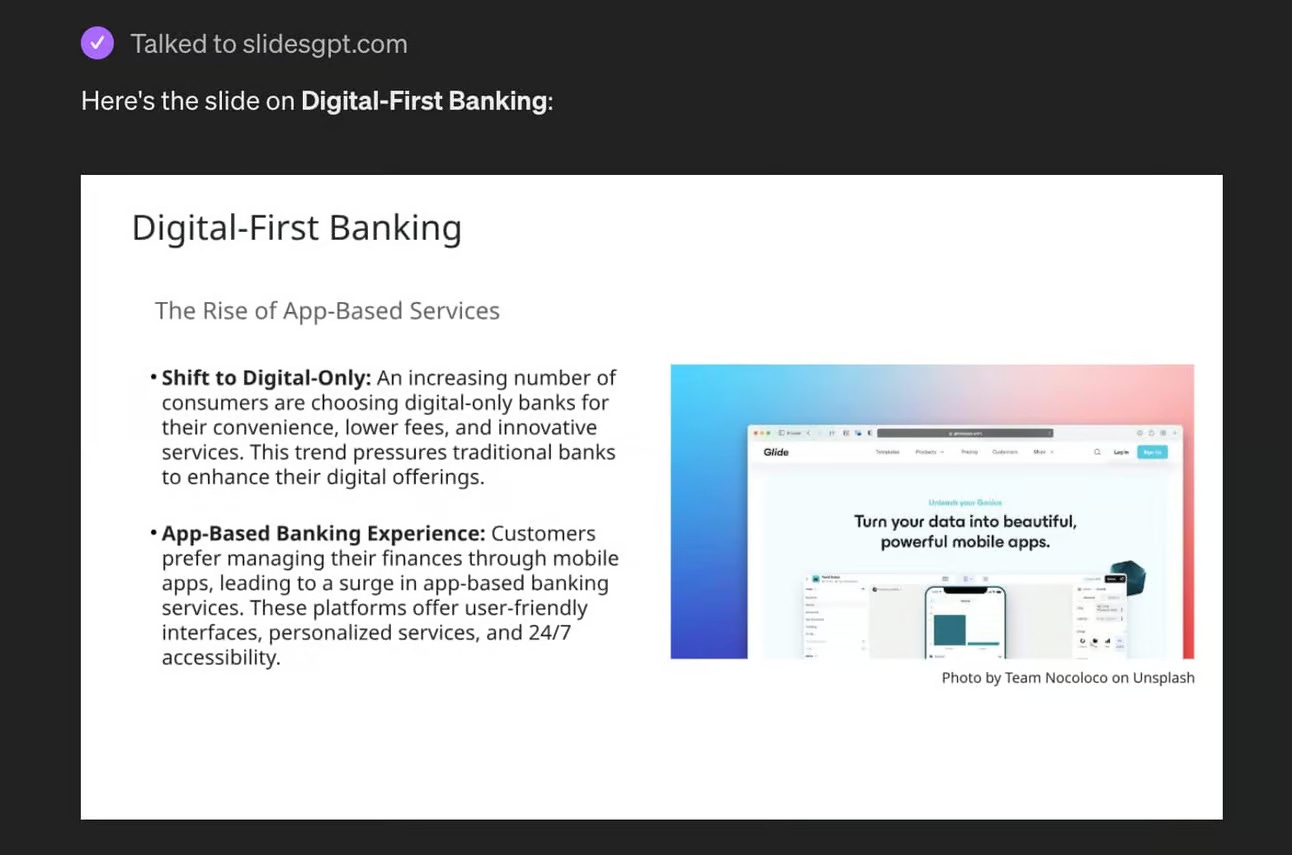Is a presentation due soon? No worries! With ChatGPTâs Slide Creator, you can quickly generate a sleek deck based on your notes or chosen topic.
