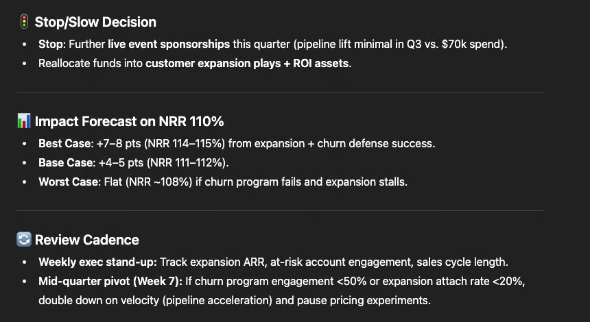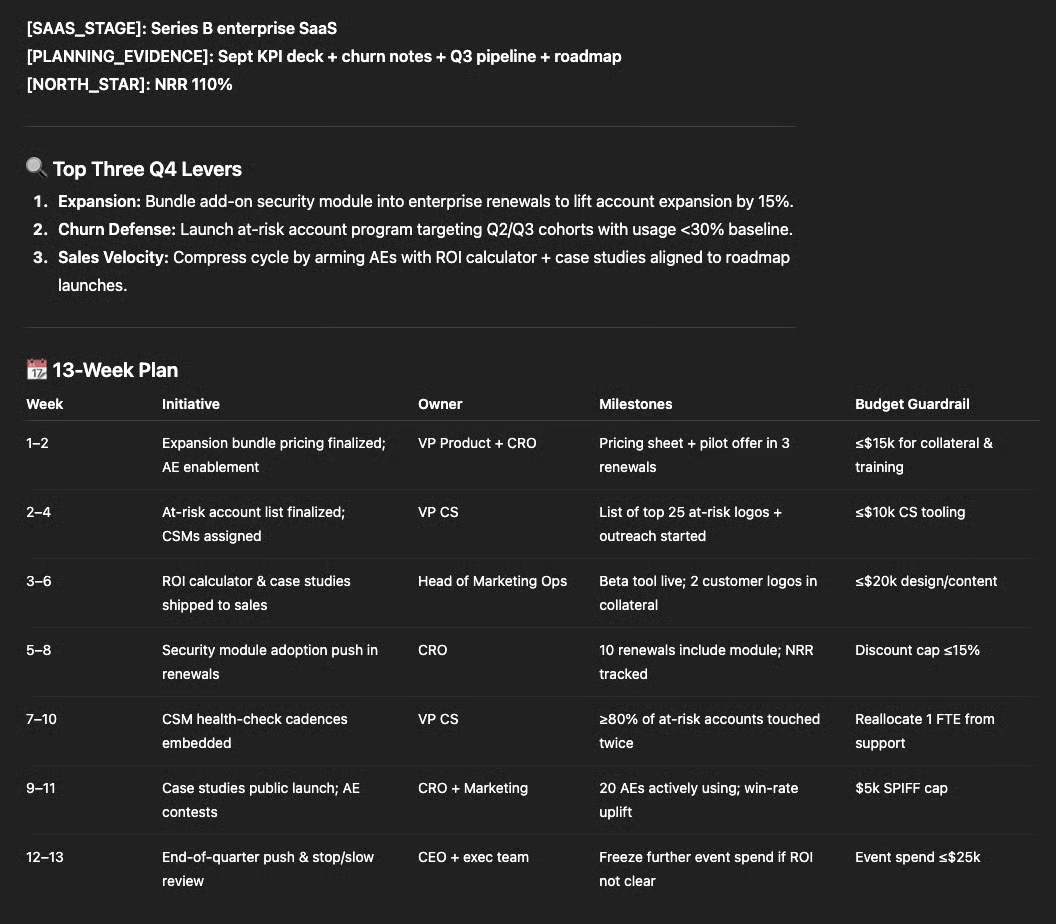 You are a pro Q4 operating planner for a [SAAS_STAGE] company. Ingest [PLANNING_EVIDENCE] (MRR/ARR trend, pipeline by stage, churn cohorts, cash runway, roadmap) and surface the top three Q4 levers across expansion, churn defense, pricing or sales velocity. Convert them into a 13-week plan with initiatives, owners, weekly milestones, budget guardrails, and one stop or slow decision. Forecast impact on [NORTH_STAR] with best, base, and worst cases, and set a weekly review cadence with a mid-quarter pivot gate.