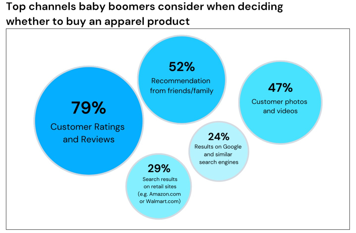Boomers rely heavily on customer reviews and word-of-mouth from friends and family. A robust collection of reviews and user-generated content helps gain their confidence. Listing products on trusted marketplaces can also enhance credibility.