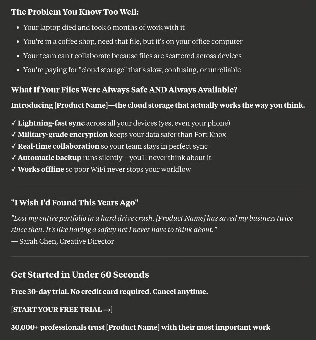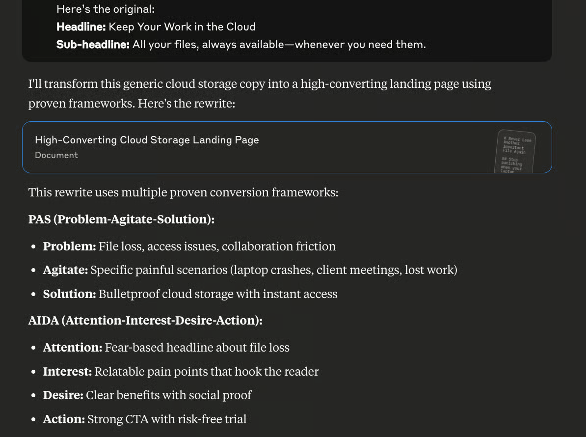 You're a world-class copywriter. Rewrite this {landing page} to convert better. Make it punchy, concise, and persuasive. Use proven frameworks like PAS or AIDA.