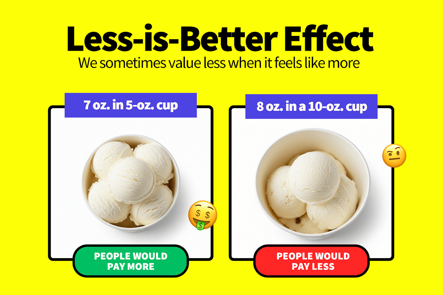 When people evaluate a single option on its own, they rely on easy visual or emotional cues rather than objective facts. A smaller option that looks premium can feel more valuable than a larger option that looks incomplete or underwhelming. But when options are compared side by side, logic kicks in and true quantity or value becomes obvious.