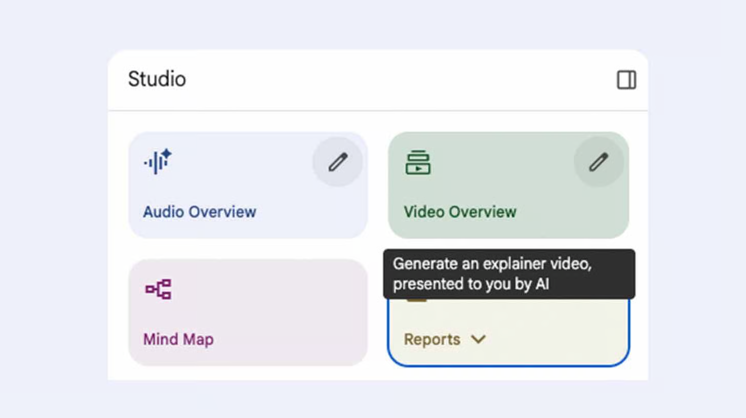 NotebookLM can generate content in multiple formats. Use Summary for quick overviews, Mind Map for visual relationships between concepts, or Video Overview for podcast-style explainers with visuals.