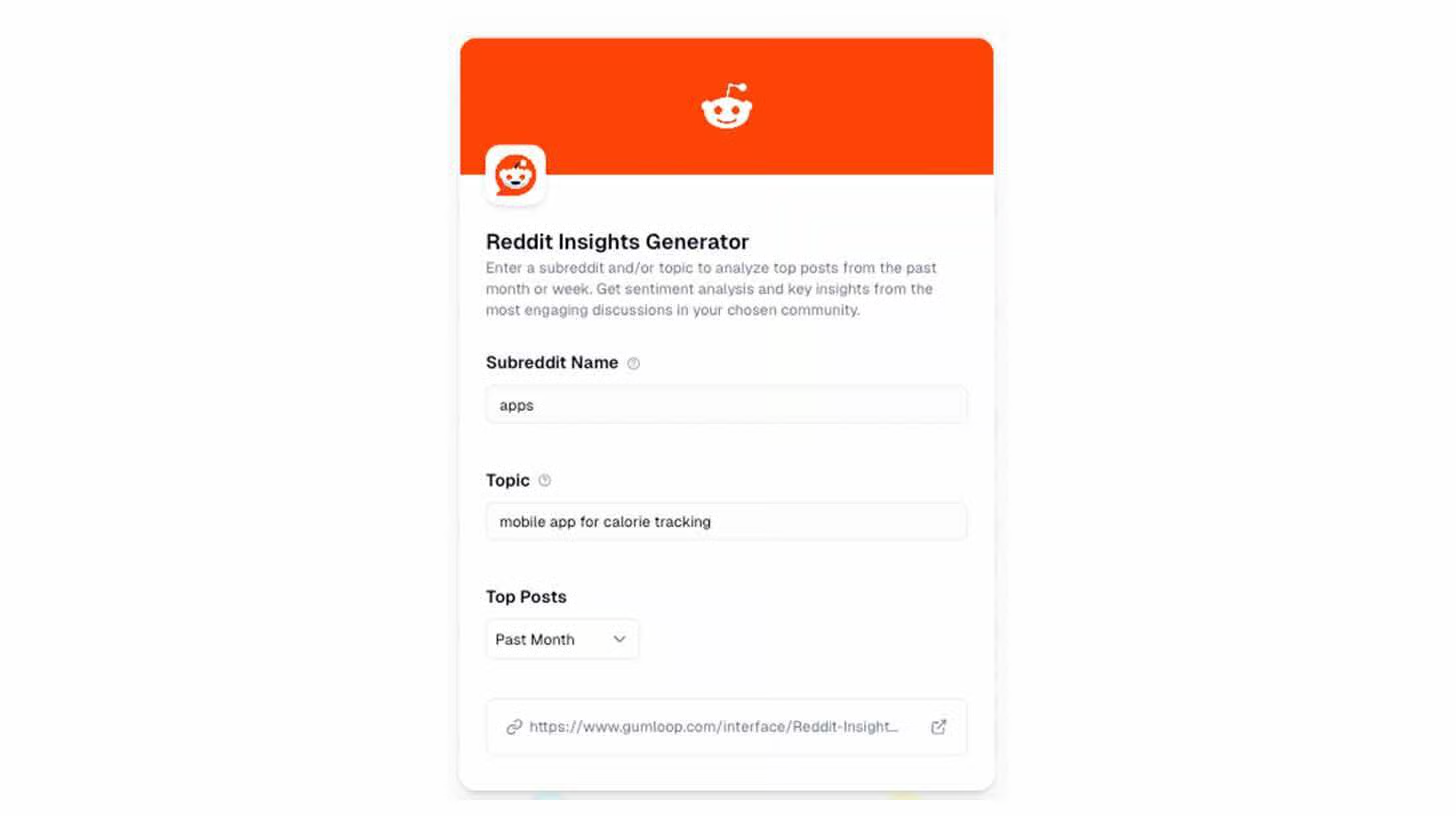 Head to the Gumloop automation platform and select the pre-built Reddit Insights template. All the nodes are pre-configured, so you just need to customize the inputs to match your research goals.