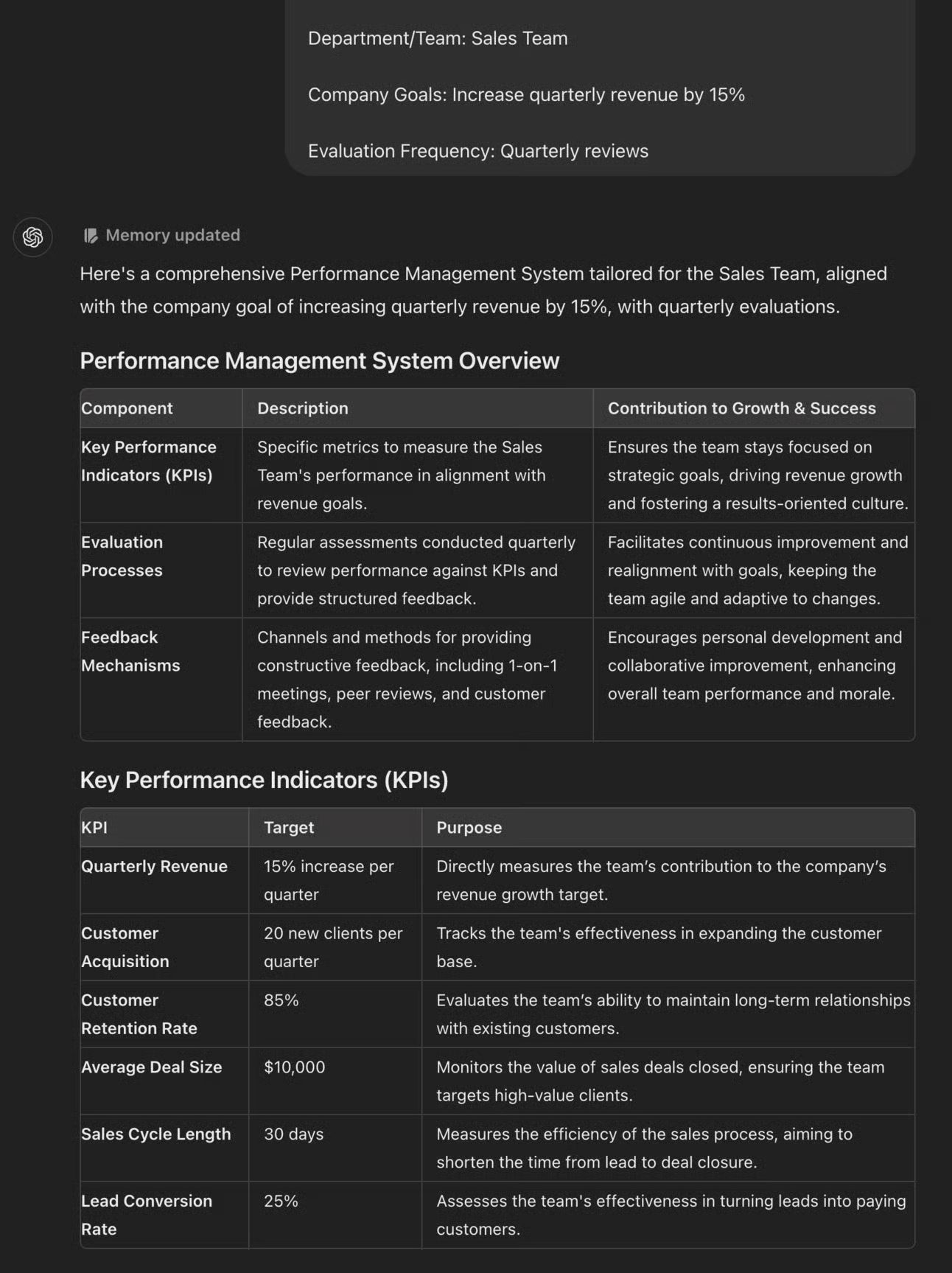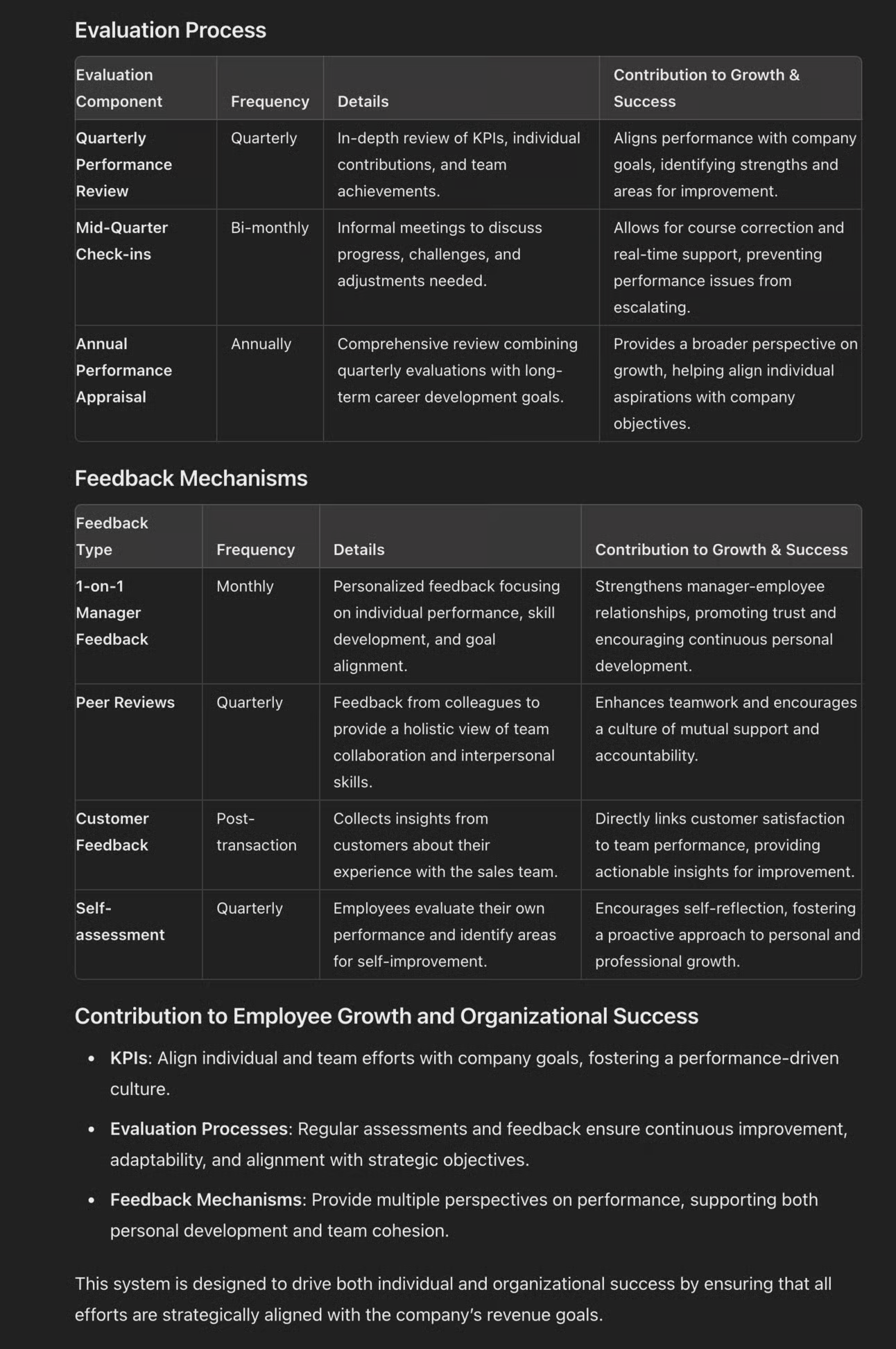 Design a comprehensive Performance Management System that includes key performance indicators (KPIs), regular evaluation processes, and feedback mechanisms. Ensure the system is tailored to the specific needs of [Department/Team], aligns with [Company Goals], and incorporates [Evaluation Frequency] for continuous improvement. Describe how each component contributes to employee growth and organizational success.