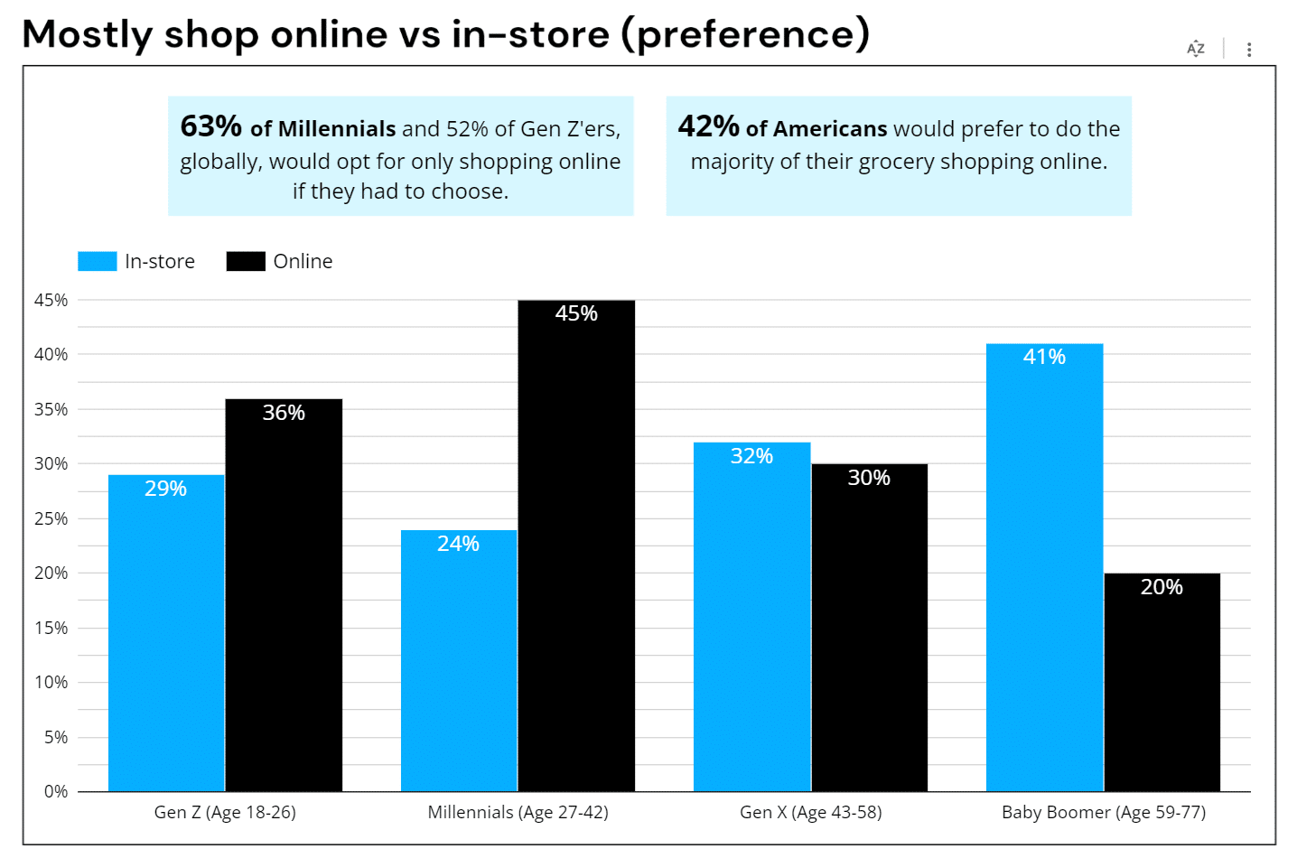 Younger generations, particularly millennials, overwhelmingly prefer online shopping, with 45% opting for digital over physical stores. Older generations, however, still lean toward offline shopping, with baby boomers choosing in-store purchases 41% of the time.