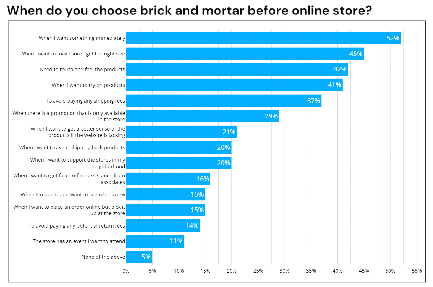 In-store shopping excels for immediate needs and tactile experiences—52% of shoppers value physical stores for items they need quickly. However, online businesses can close the gap by offering free shipping, detailed descriptions, and augmented reality tools.