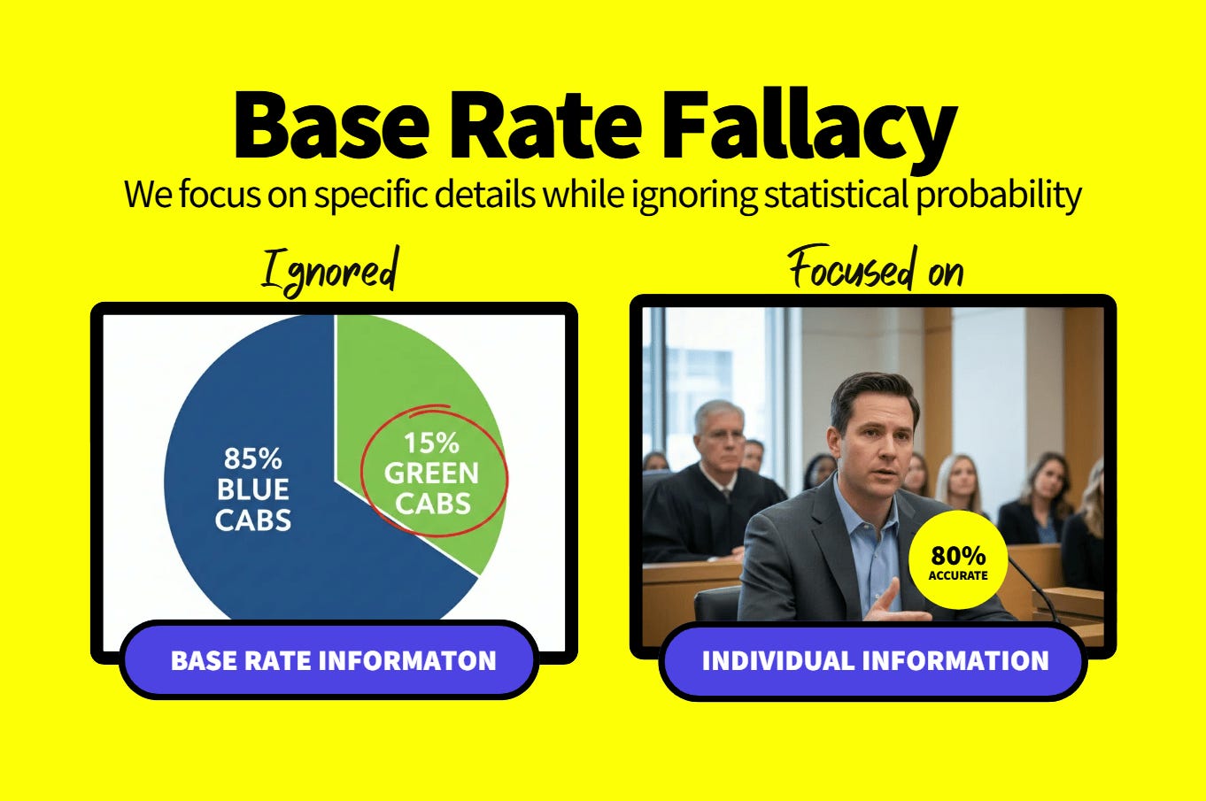 It happens when someone ignores the big-picture probability (the base rate) and instead focuses on one attention-grabbing detail.