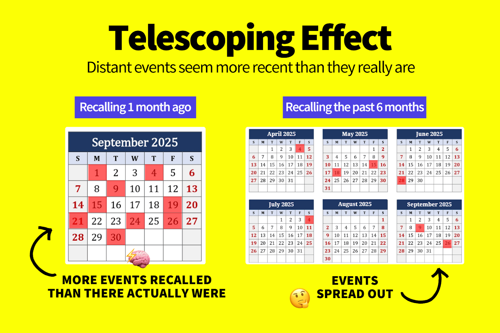 Have you ever felt like a purchase you made âjust last monthâ actually happened five months ago? Thatâs the Telescoping Effect, our mindâs tendency to misjudge the timing of past events. We often believe older experiences happened more recently (forward telescoping) or that recent ones occurred further back (backward telescoping).