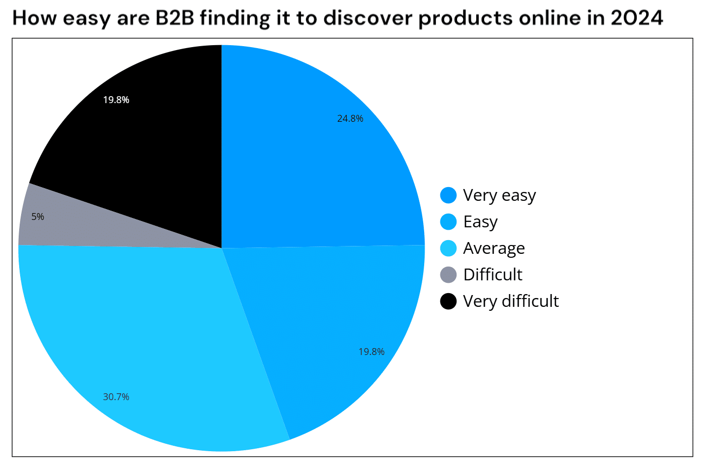 A quarter of B2B buyers struggle to find products online. While nearly half find it easy, 30% report only an āaverageā experience, highlighting gaps in awareness campaigns and website navigation. Enhancing on-page elements and making navigation user-friendly can improve discoverability.