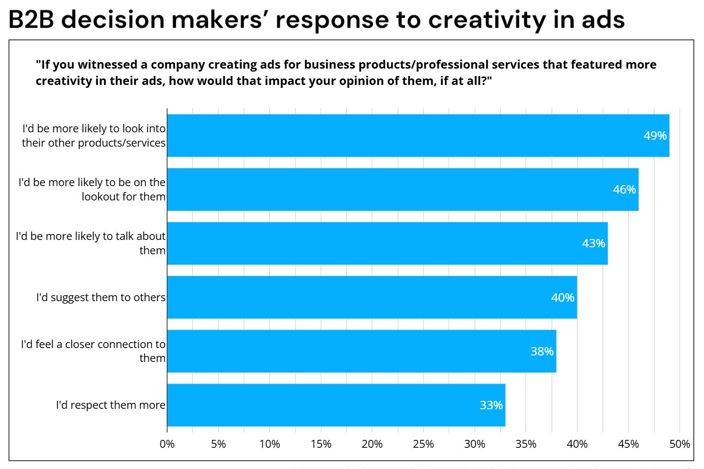 The traditional B2B approach is shifting, with buyers increasingly drawn to creative and engaging ads. Unique visuals, humor, or storytelling can boost interestā50% of buyers are more likely to explore brands that break the mold. Creativity may be the edge needed in a crowded space.