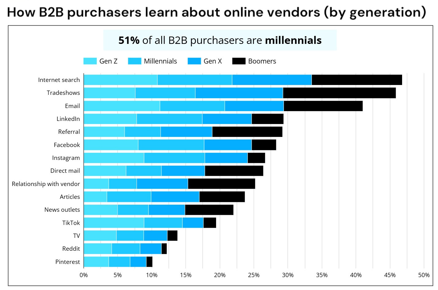 Millennials, the largest group in B2B purchasing, favor internet searches, while younger buyers also rely on LinkedIn and other social media. Older generations value referrals and direct relationships. Tailor outreach based on these generational preferences to boost brand exposure.