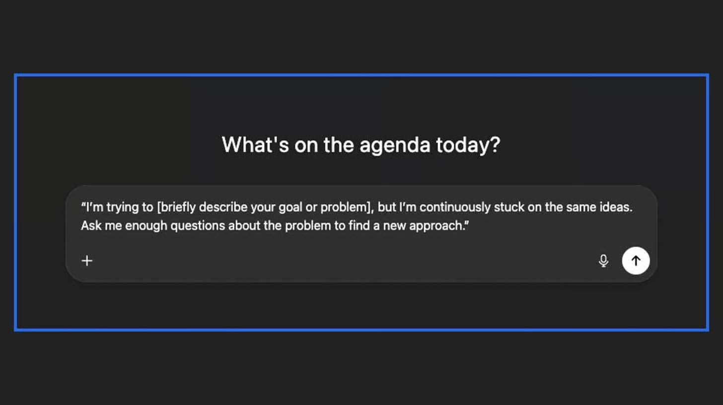 Open ChatGPT and write a clear prompt like: “I’m trying to solve [goal or problem], but I keep repeating the same ideas. Ask me enough questions to find a new approach.”