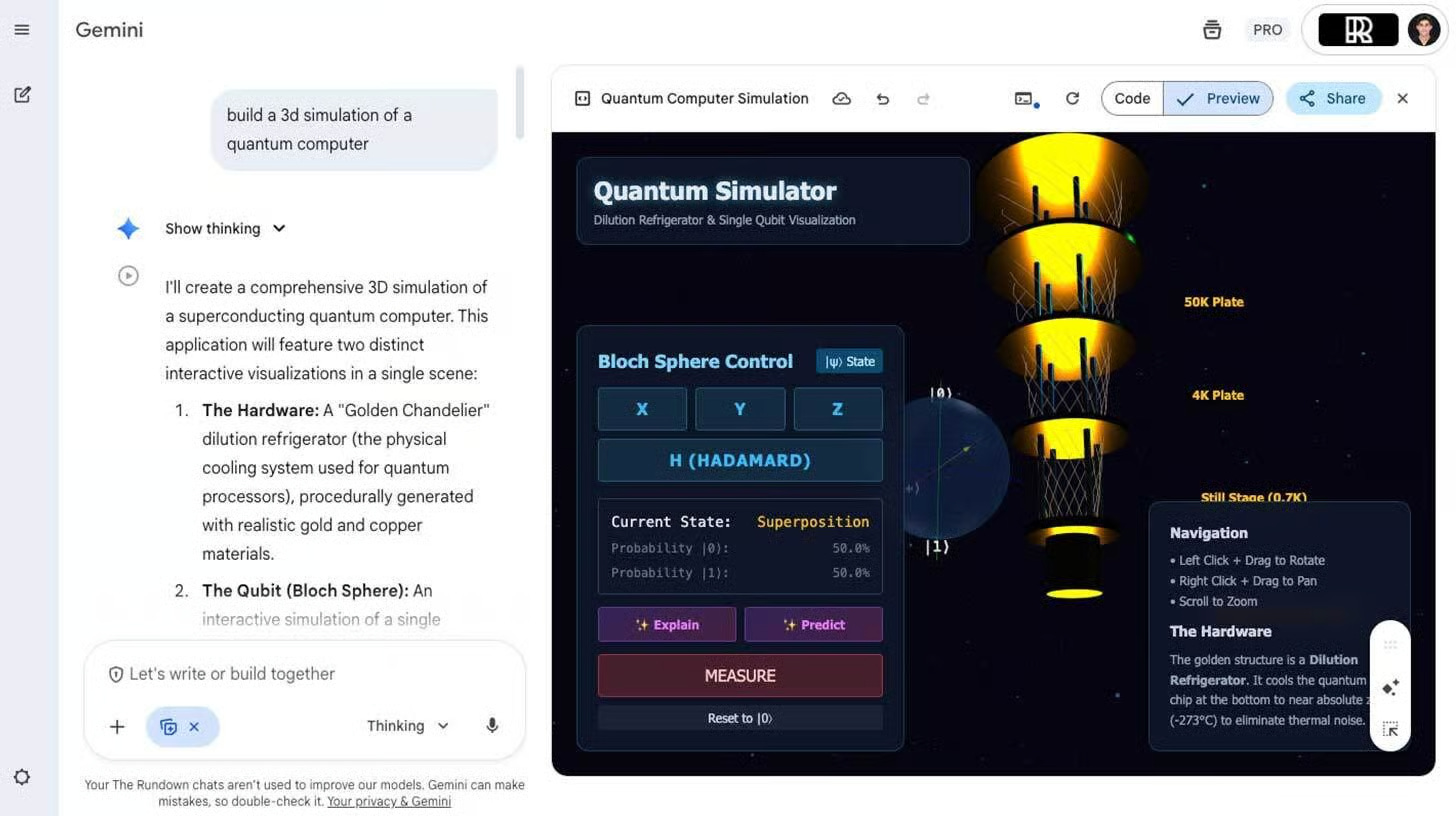 Gemini 3 generates a visual, interactive simulation rather than a static explanation. Explore how it behaves, interact with elements, and test different scenarios directly inside the output.