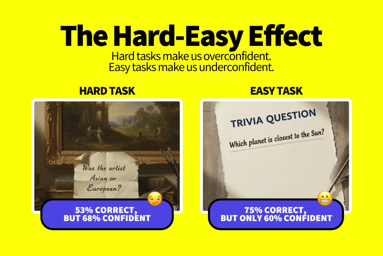 When a task is difficult, people tend to be overconfident. They lack the knowledge needed to recognize mistakes, so they assume they did better than they actually did. When a task is easy, the opposite happens. People know enough to overthink small details, doubt themselves, and delay decisions.