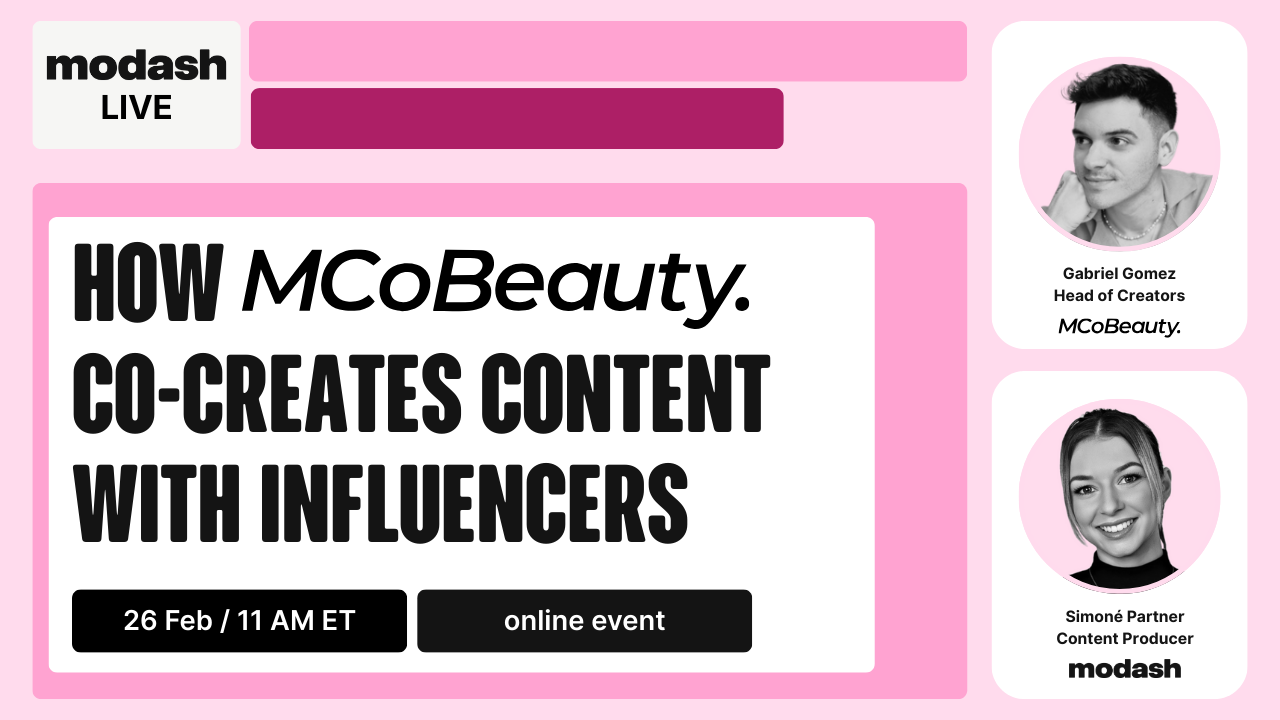 Join Gabriel Gomez, Head of Social and Creators at MCoBeauty, hosted by Modash, for a practical session on how co-creation fits into a working creator program. You will see real case studies, learn how MCoBeauty selects creators for co-creation, and understand what production actually looks like.