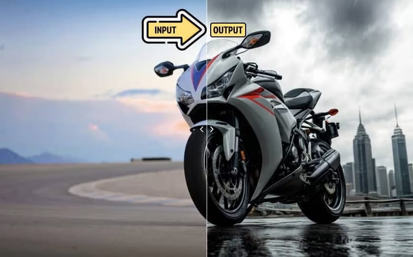You have two options: either upload another image as a scene reference in the "Scene Image" section or describe the desired scene in the "Scene Prompt" box. For example, you might use a prompt like “bike on the road, rainy cloudy sky, and skyscrapers in the background.”